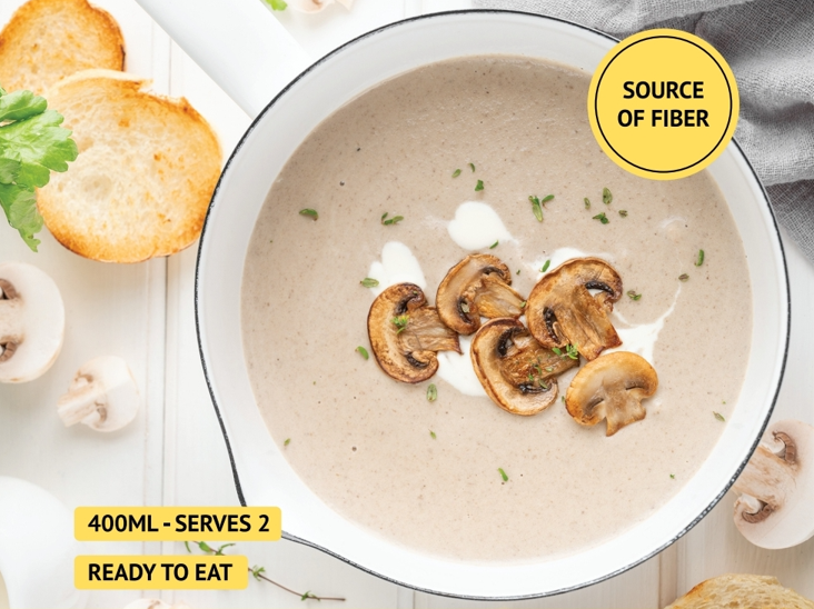 Farm fresh mushrooms, caramelised and slow cooked with onion, garlic and thyme, blended with a dollop of cream to give you a deliciously velvety soup. Enjoy the flavours of earthy, wholesome ingredients and real mushrooms in every bite. Pair it with garlic bread and enjoy a yummy meal! 100% vegetarian.